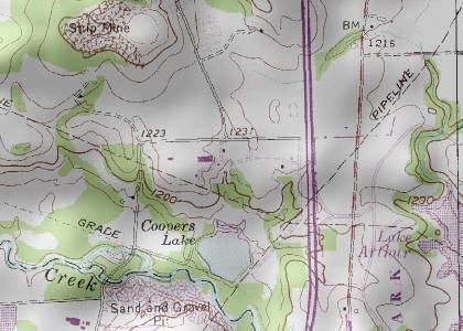 - 2009B23 Frostburn Map.pdf (75KB) is the first version of the map from November 23, 2009. It includes the Cooper's Lake roads, landmarks, and topographic contour lines.